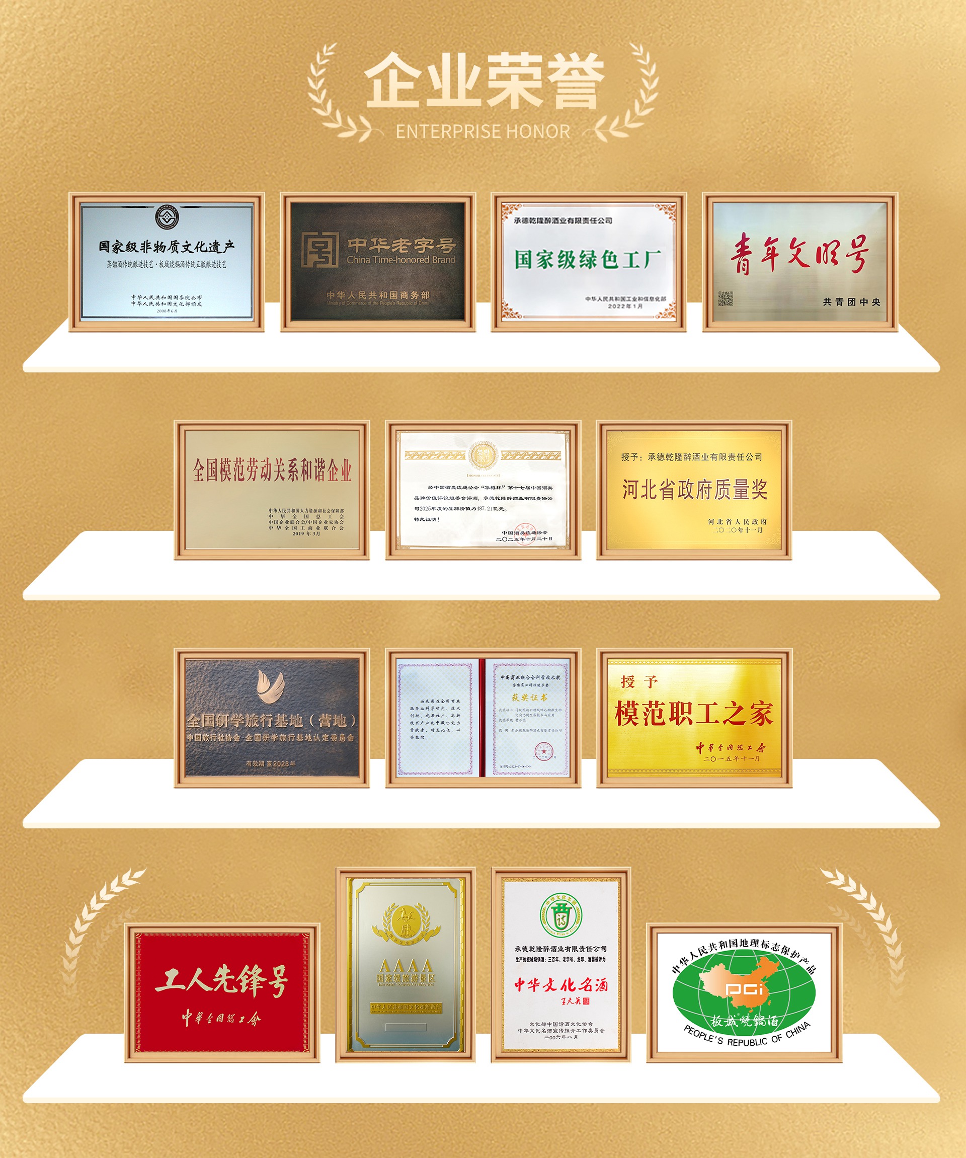 企業(yè)快速發(fā)展的同時(shí),也贏得了社會(huì)的廣泛贊譽(yù)。公司擁有國家專利8項(xiàng),注冊商標(biāo)124個(gè),先后榮獲“中華老字號(hào)”、“國家級(jí)非物質(zhì)文化遺產(chǎn)”、“國家地理標(biāo)志保護(hù)產(chǎn)品”、“國家級(jí)綠色工廠”、“中華文化名酒”、“全國模范職工之家”、“全國模范勞動(dòng)關(guān)系和諧企業(yè)”、“國家級(jí)青年文明號(hào)”、“全國工人先鋒號(hào)”“國家AAAA級(jí)景區(qū)”、“河北省政府質(zhì)量獎(jiǎng)”“第十五屆“華樽杯”板城品牌價(jià)值449.82億元”等上百項(xiàng)榮譽(yù)。