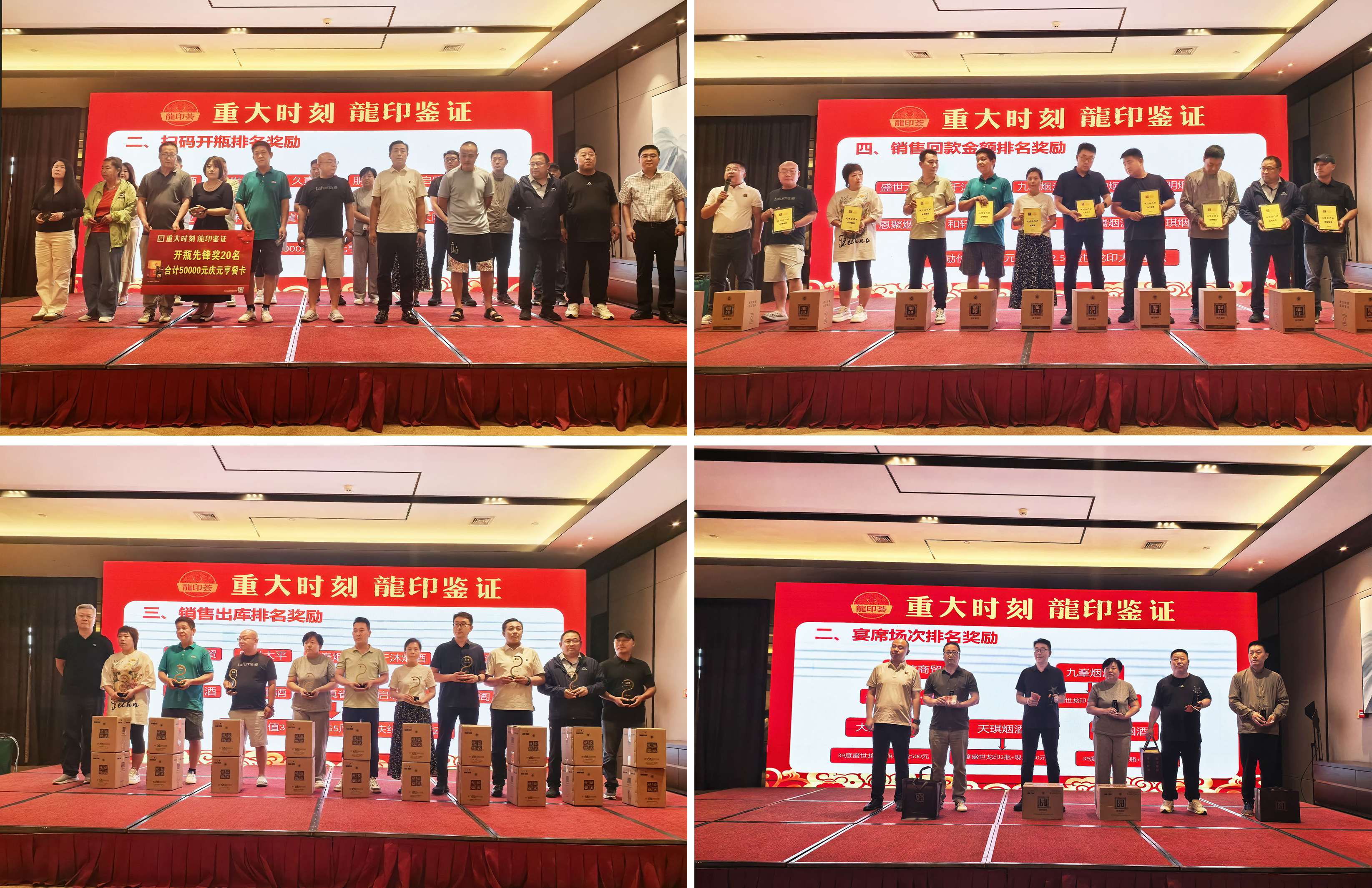 為感謝經(jīng)銷商伙伴長(zhǎng)久以來(lái)的支持和貢獻(xiàn),活動(dòng)現(xiàn)場(chǎng)還設(shè)置了頒發(fā)環(huán)節(jié),石家莊戰(zhàn)區(qū)龍印部銷售總監(jiān)孫坤申、恒潤(rùn)德酒類品牌管理有限公司董事長(zhǎng)潘雁群、石家莊戰(zhàn)區(qū)龍印部區(qū)域經(jīng)理徐立國(guó)、恒潤(rùn)德酒類品牌管理有限公司龍印事業(yè)部經(jīng)理張?jiān)謩e為開(kāi)瓶率、履約、回款、宴席做出突出貢獻(xiàn)的終端客戶進(jìn)行頒獎(jiǎng)。