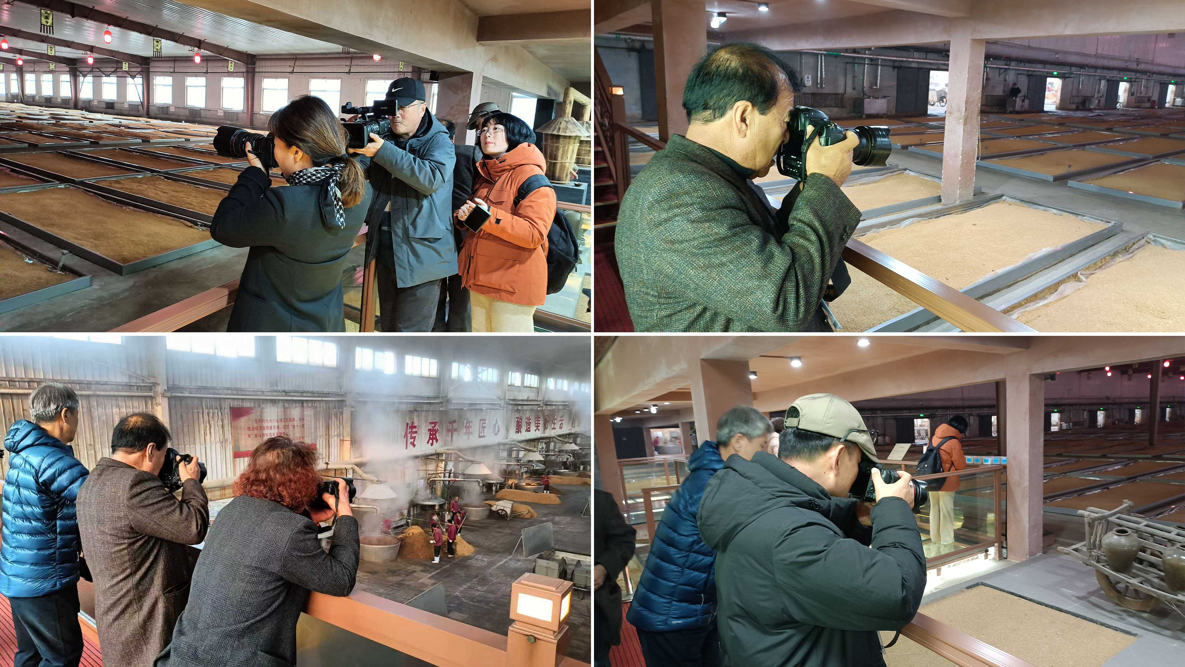 隨后,中韓攝影家們先后參觀了板城燒鍋酒博物館與生產(chǎn)廠區(qū),深入了解了從選糧、發(fā)酵、蒸餾到陳釀的全流程工藝。攝影家們穿梭于古樸的窖池與現(xiàn)代生產(chǎn)線之間,不斷按下快門(mén),記錄下工人勞作的身影、蒸汽氤氳的車(chē)間場(chǎng)景,以及充滿(mǎn)歲月痕跡的酒器文物。光影交錯(cuò)間,北方白酒釀造的文化底蘊(yùn)與工業(yè)美學(xué)被一一凝固定格。