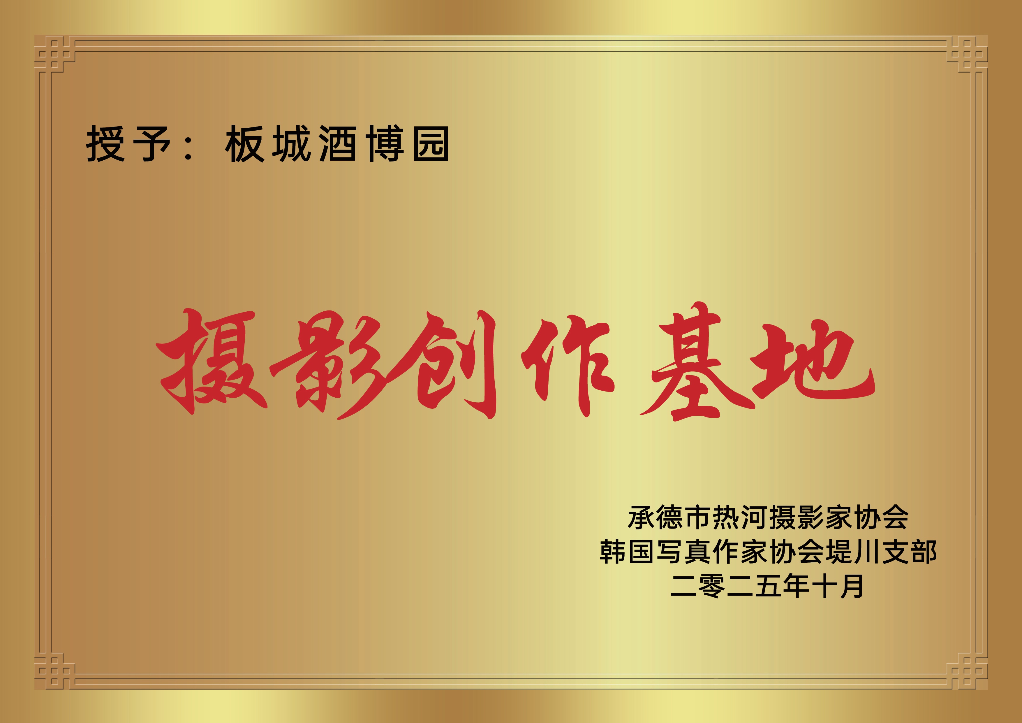 活動(dòng)現(xiàn)場(chǎng)由河北省攝影家協(xié)會(huì)副主席、市文聯(lián)名譽(yù)主席衣志堅(jiān),承德熱河攝影家協(xié)會(huì)主席楊利民與韓國(guó)寫(xiě)真協(xié)會(huì)堤川支部長(zhǎng)金序潤(rùn)共同授予板城酒業(yè)“板城酒博園攝影創(chuàng)作基地”的殊榮。