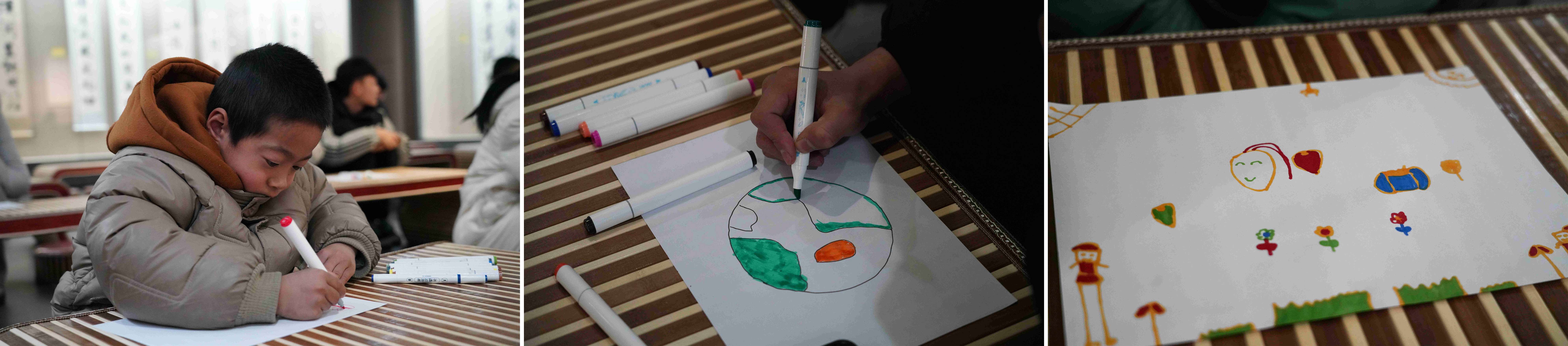 兒童組“我的快樂星球”藝術(shù)創(chuàng)作:在一個布置著字畫與小桌椅的溫馨展廳里,孩子們在專業(yè)引導(dǎo)下,拿起畫筆,通過色彩與線條自由表達(dá)情緒,描繪出各自獨(dú)一無二的“快樂星球”。童真的畫作,成為他們內(nèi)心世界的生動寫照。